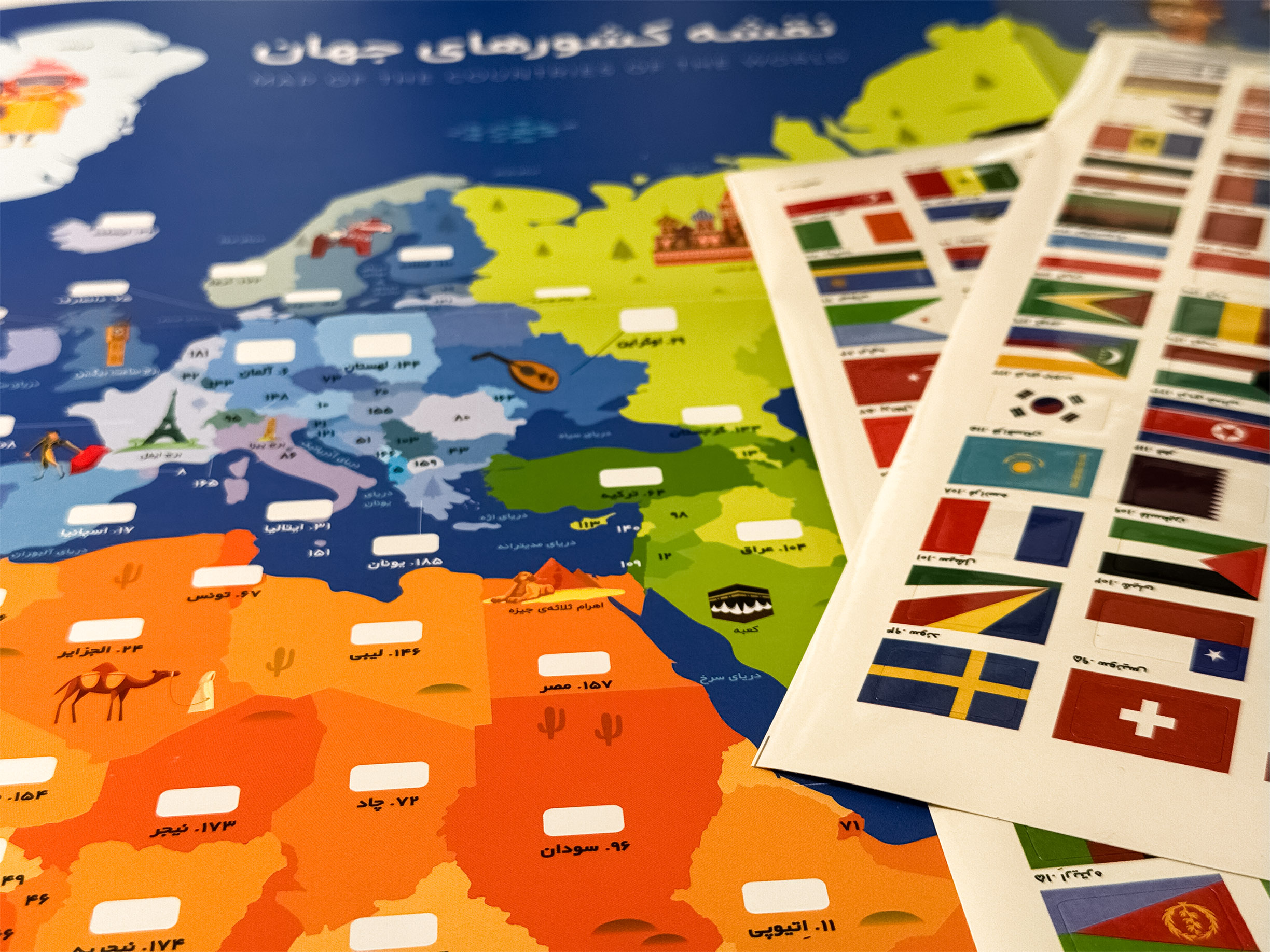 به علاوه، این بازی به تقویت تمرکز، هوش و دانش جغرافیایی کمک میکند و اعتماد به نفس کودکان را از طریق یادگیری اطلاعات جهانی تقویت میکند.نحوه بازی بسیار ساده است: بر روی نقشه و برگههای برچسب، هر کشور با شمارهای مشخص شده است. پرچم هر کشور را از برگههای برچسب بچین و در جای مناسب بر روی نقشه بچسبان. برچسبها را به آرامی روی نقشه بچسبانید؛ تا اگر اشتباهی شد بتوانید به راحتی آن را از صفحه جدا کنید.